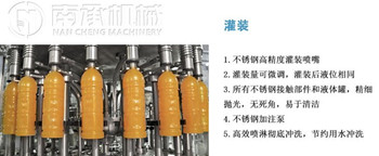 一條完整的原果汁飲料生產(chǎn)線包含純凈水生產(chǎn)統(tǒng)、原果榨汁、過濾、配料、均質(zhì)、脫氣、殺菌系統(tǒng)、全自動吹瓶機、空瓶風(fēng)力輸送、果汁飲料熱灌裝機、自動上蓋機、瓶蓋消毒設(shè)備 成品輸送、倒瓶殺菌機、噴淋殺菌冷卻設(shè)備、強力吹干機、激光噴碼機、貼標(biāo)機、紙箱包裝機。